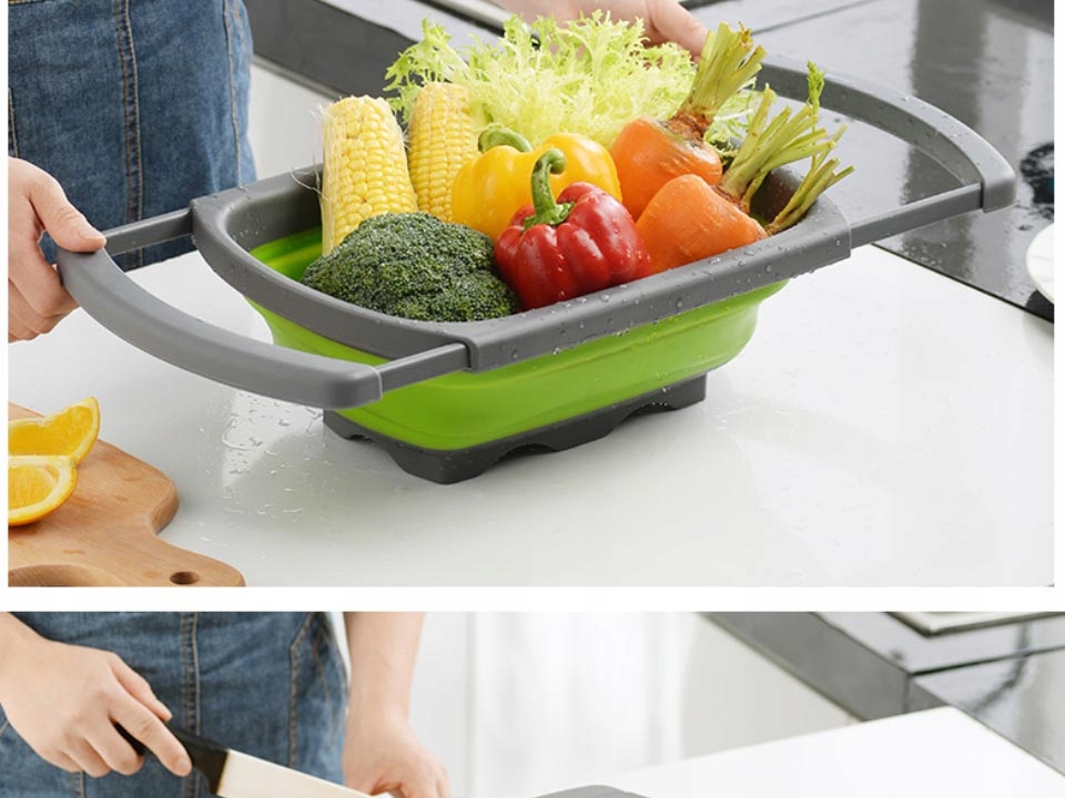 Silikonowy durszlak z rozkładanymi uchwytami na zlew