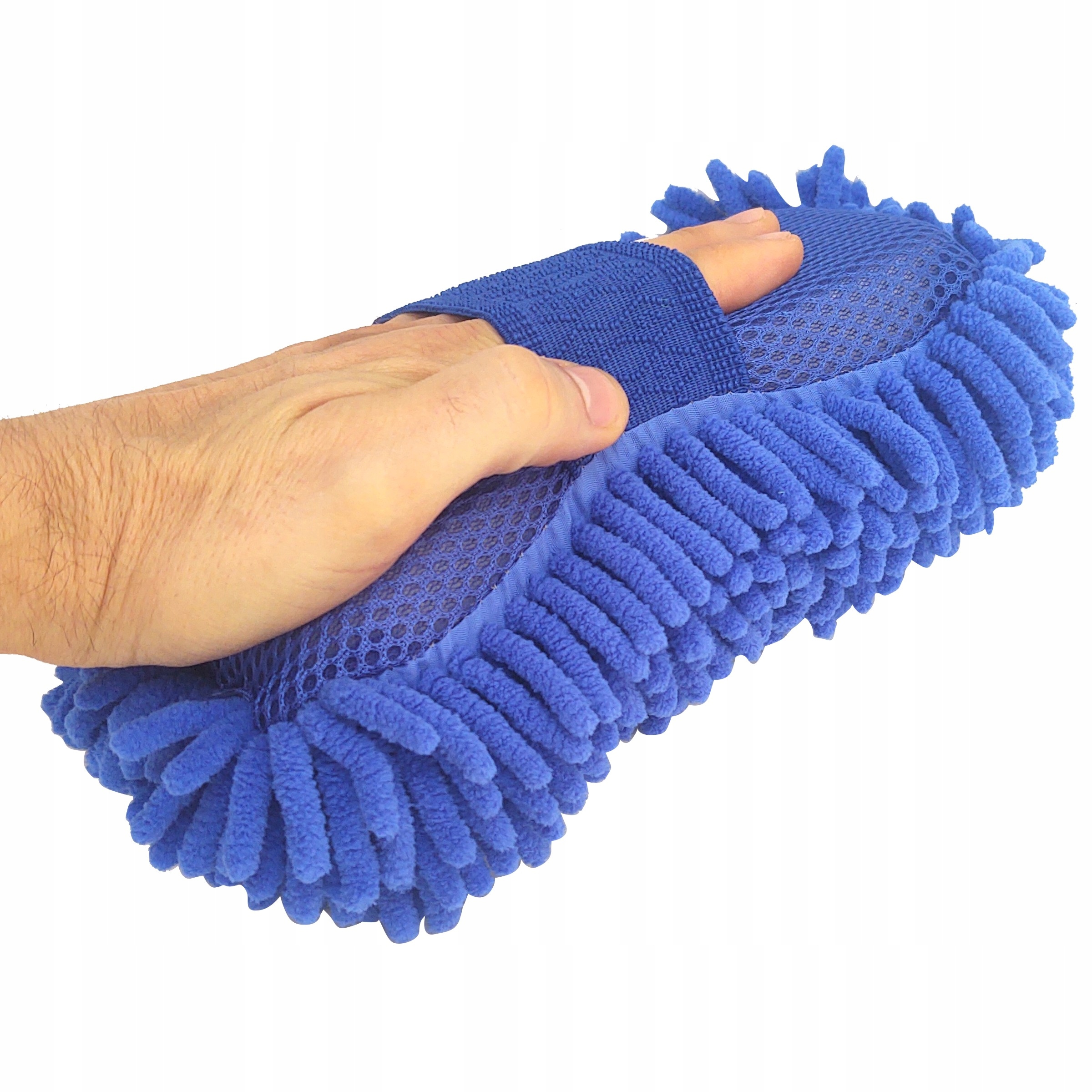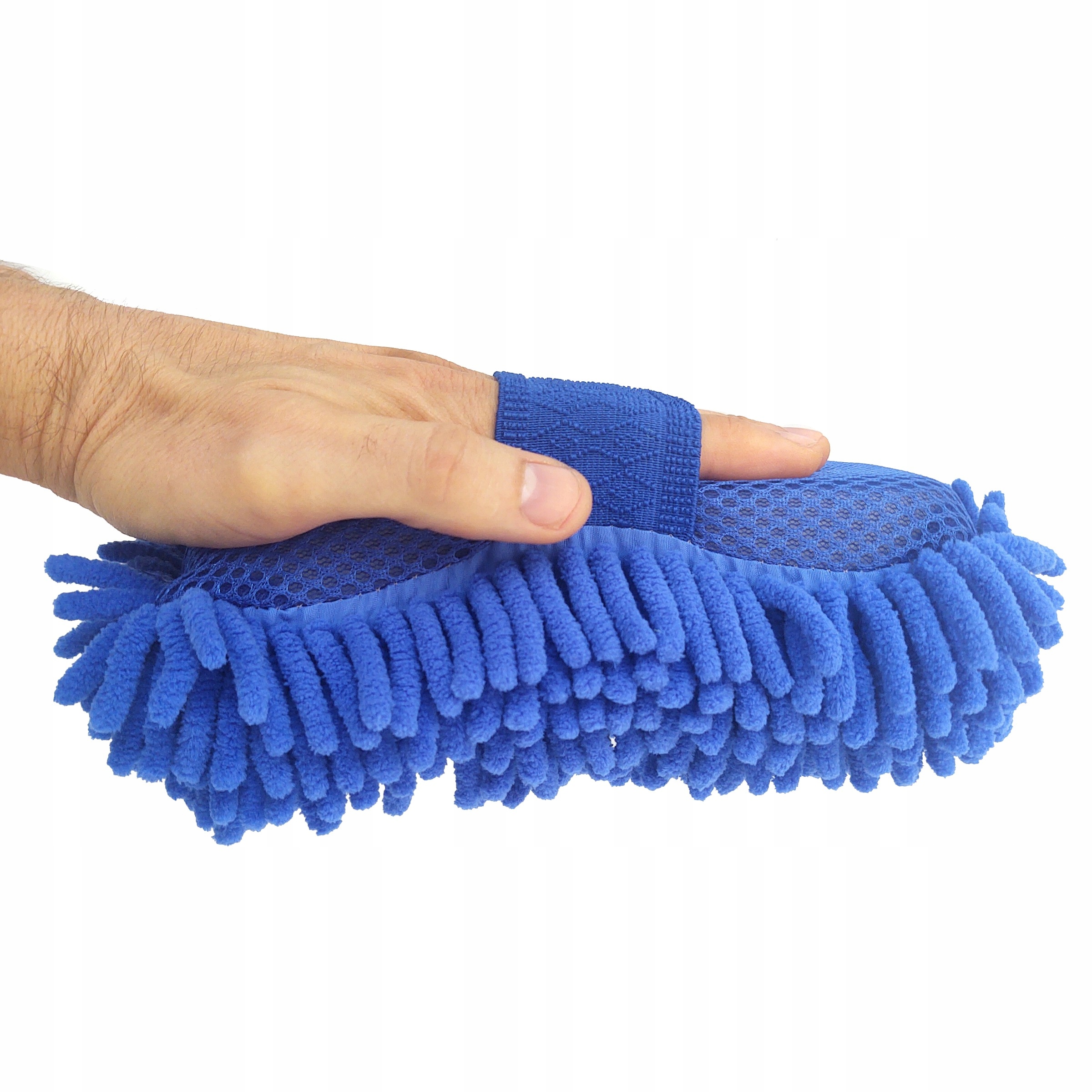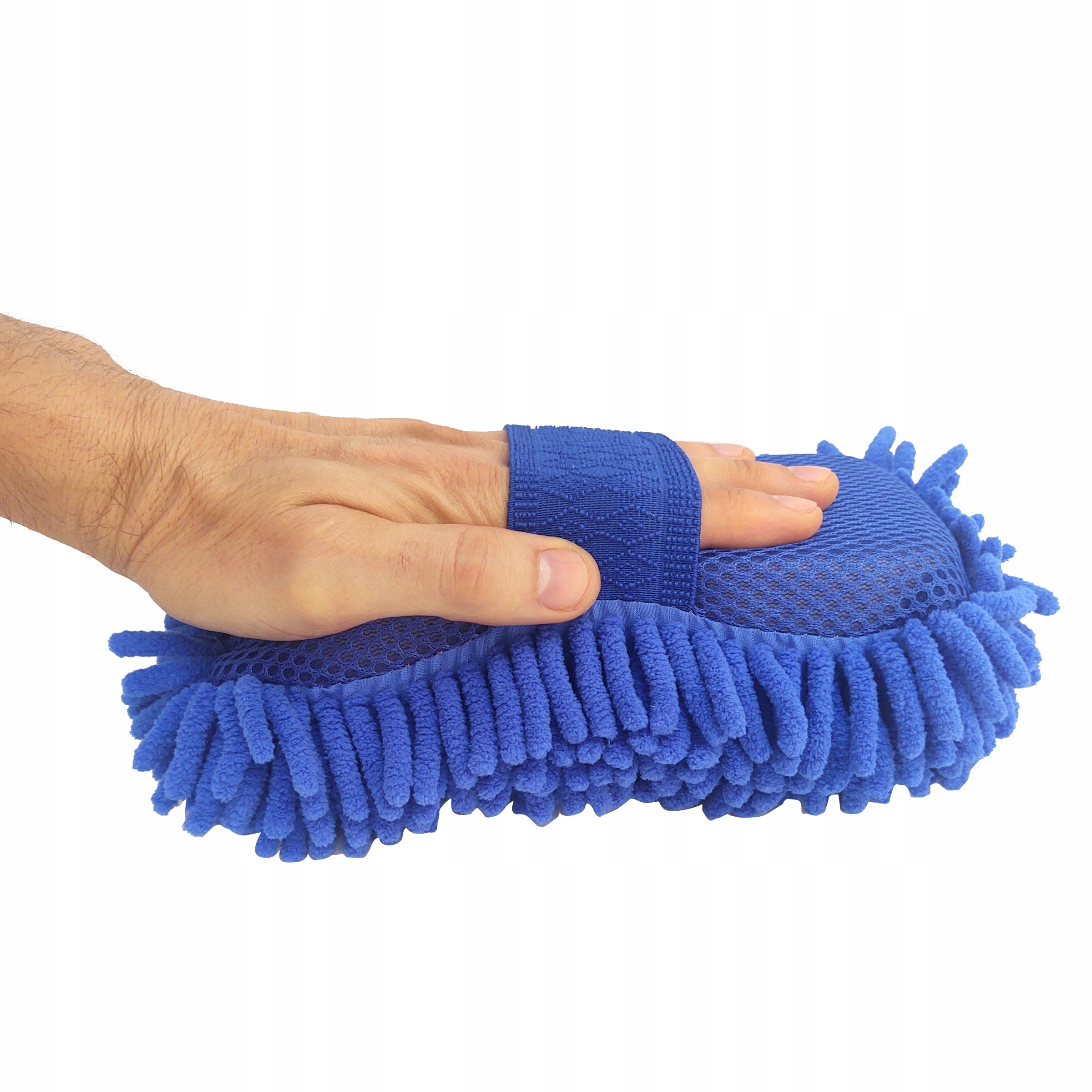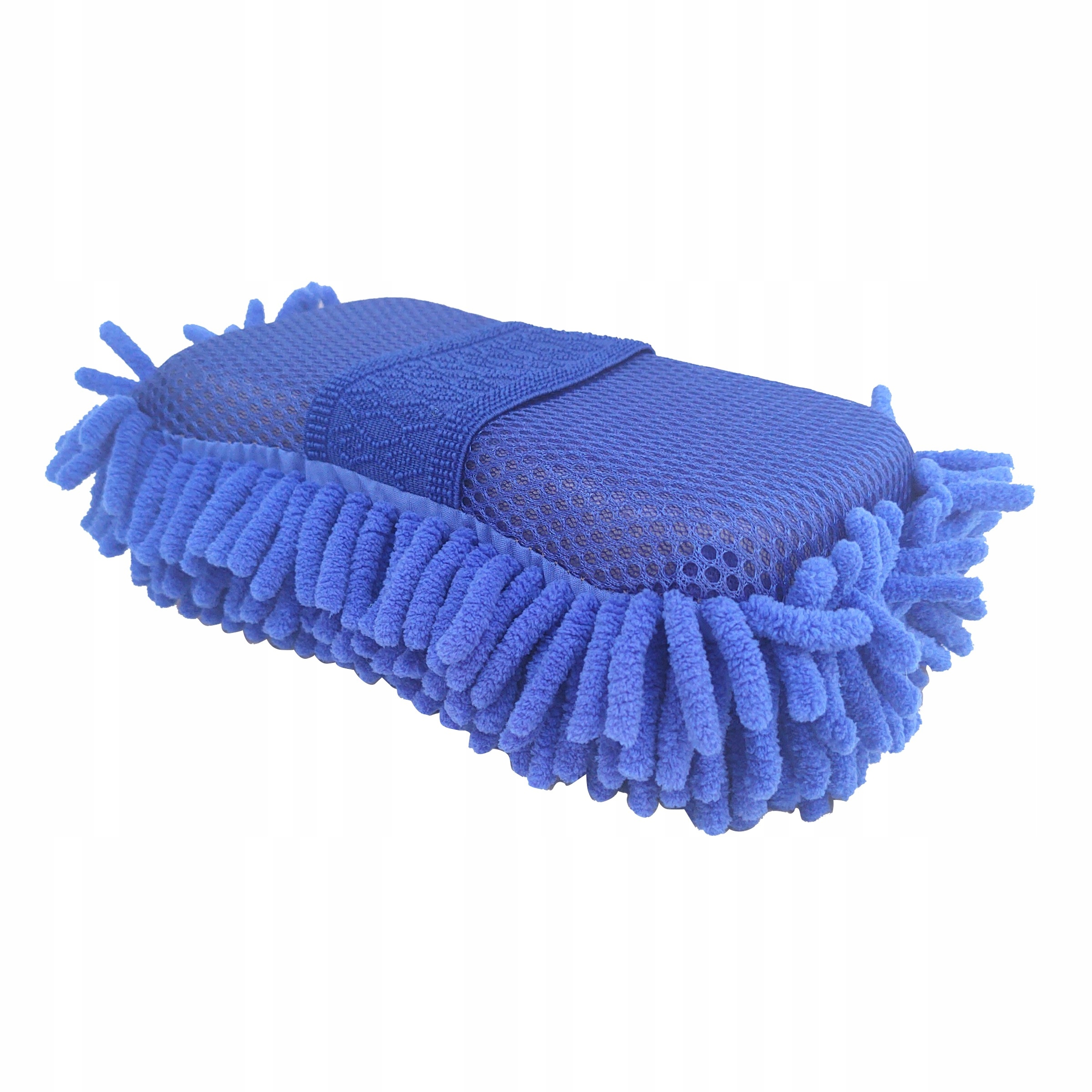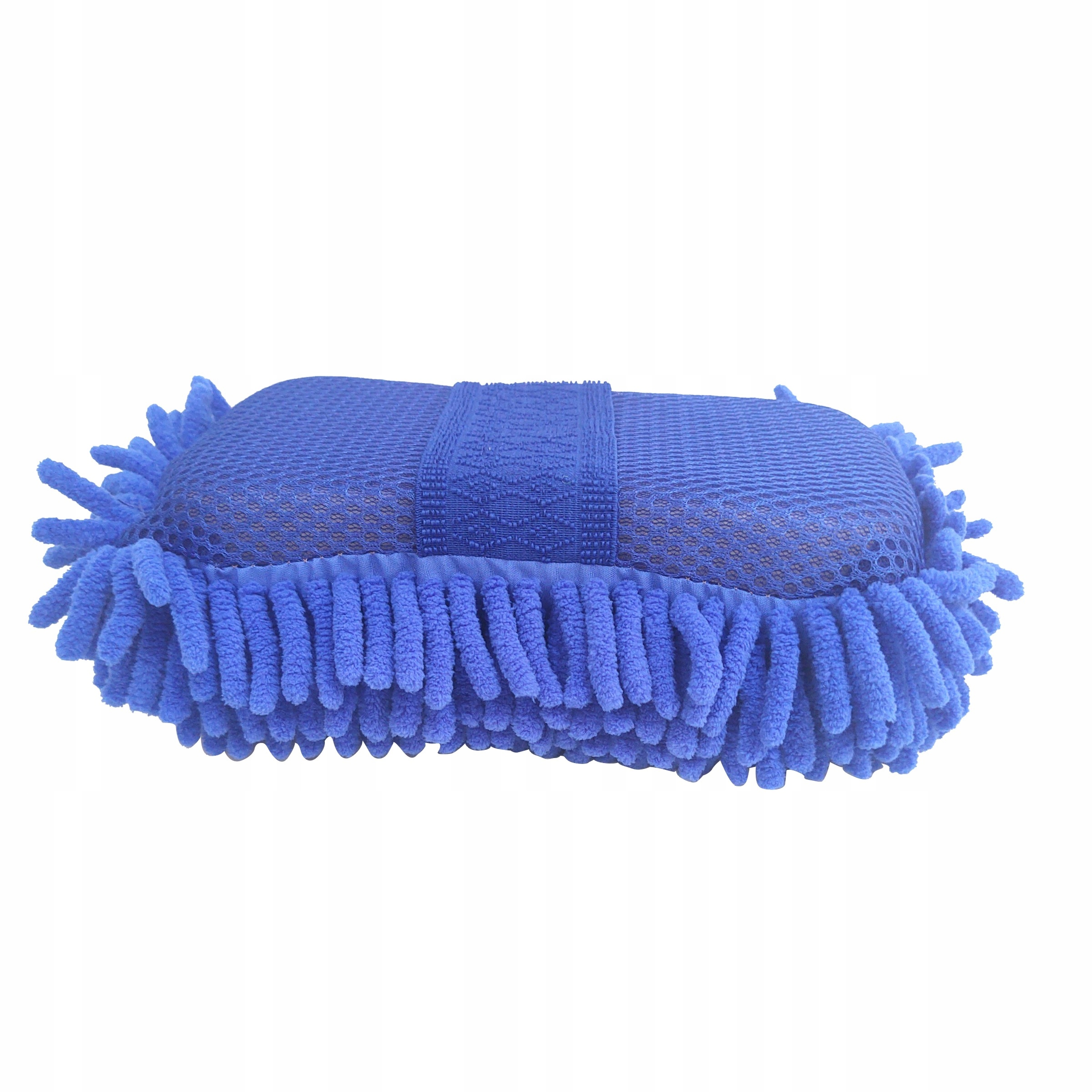 Gąbka z jednej strony posiada delikatne frędzle z mikrofibry, a z drugiej siatkę, która idealnie sprawdzi się przy cięższych zabrudzeniach.