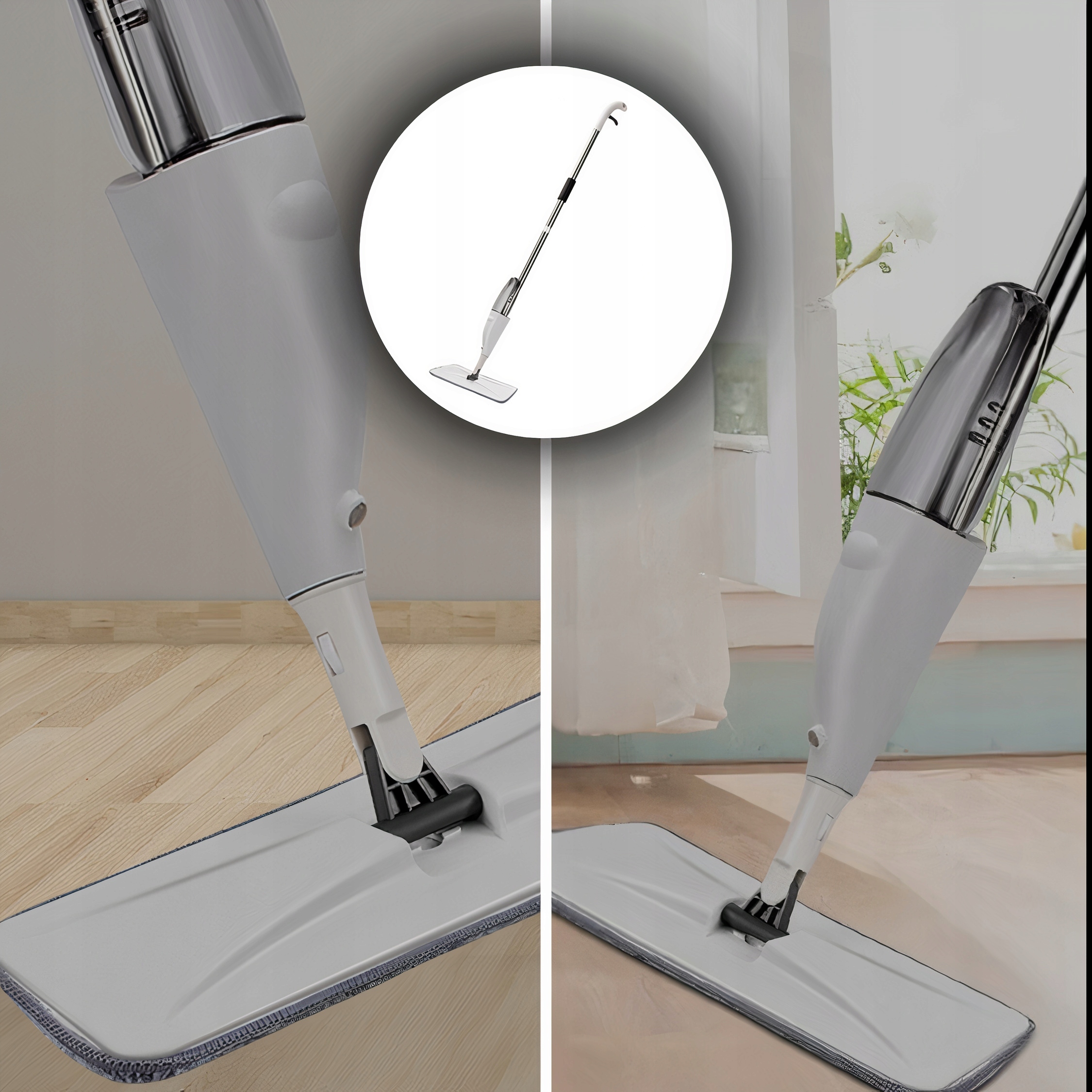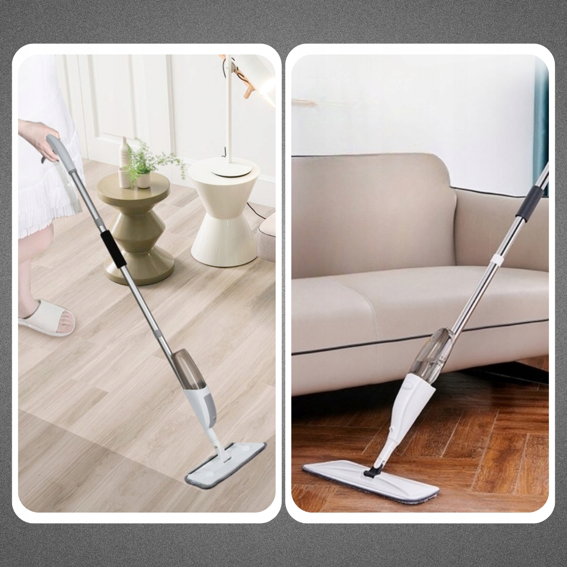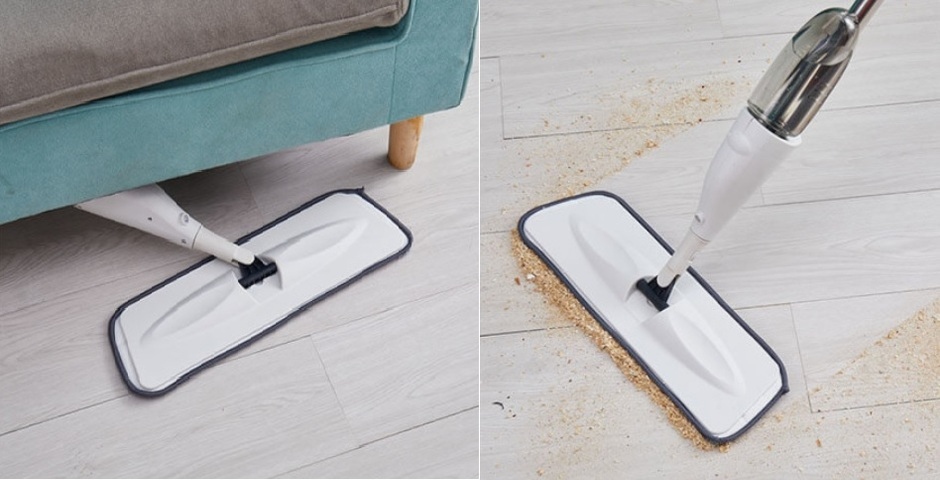Nasz mop został wyposażony w wbudowany spryskiwacz i zbiornik na wodę, co pozwala na wygodne sprzątanie bez uciążliwego zanurzania mopu w wodzie. Wystarczy spryskać wodą i detergentem prosto z naszego spryskiwacza. Dzięki wbudowanemu spryskiwaczowi i zbiornikowi na wodę, nasz mop zapewnia wygodę i efektywność podczas sprzątania. Nie musisz już nieustannie wracać po wodę i moczyć mopu. Wystarczy nacisnąć spryskiwacz, aby rozprowadzić równomiernie wodę i detergent na podłodze, co ułatwia usunięcie uporczywych plam i brudu.