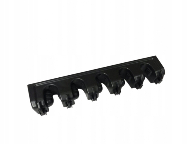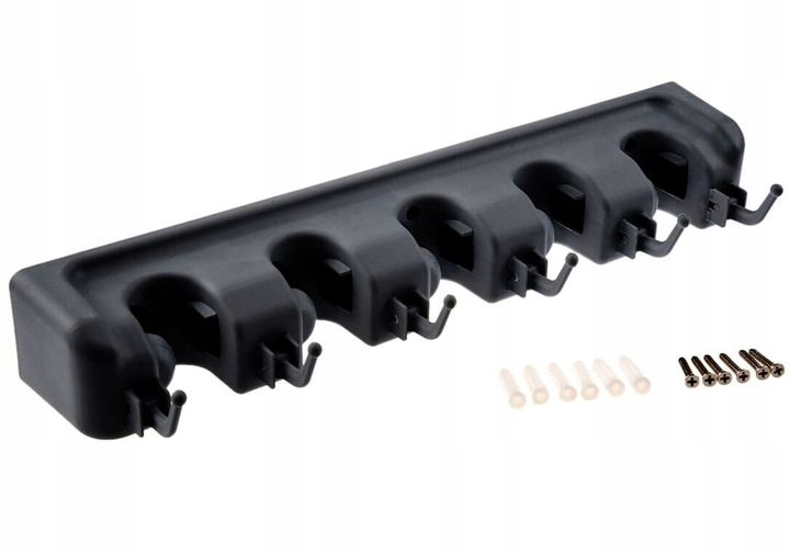 Wieszak wyposażony jest w aż pięć automatycznych uchwytów. Każdy uchwyt z jednej strony ma kulkę samozaciskową, a z drugiej wyposażony jest w gumę ze stoperem. Uchwyty same dostosowują się do grubości trzonka narzędzia.