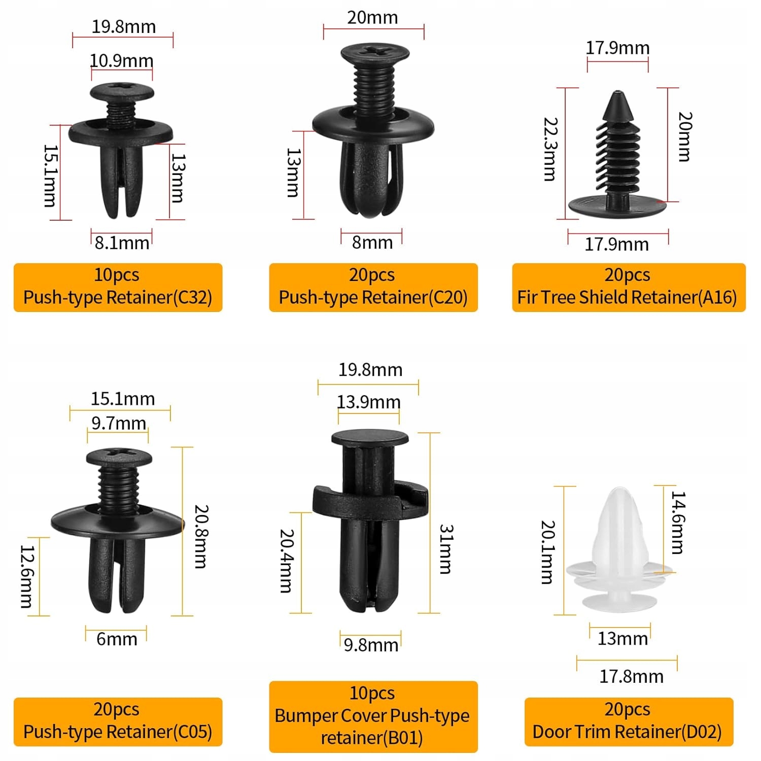 ➡️ Zestaw zawiera różne typy klipsów, aby dopasować je do wielu elementów auta.