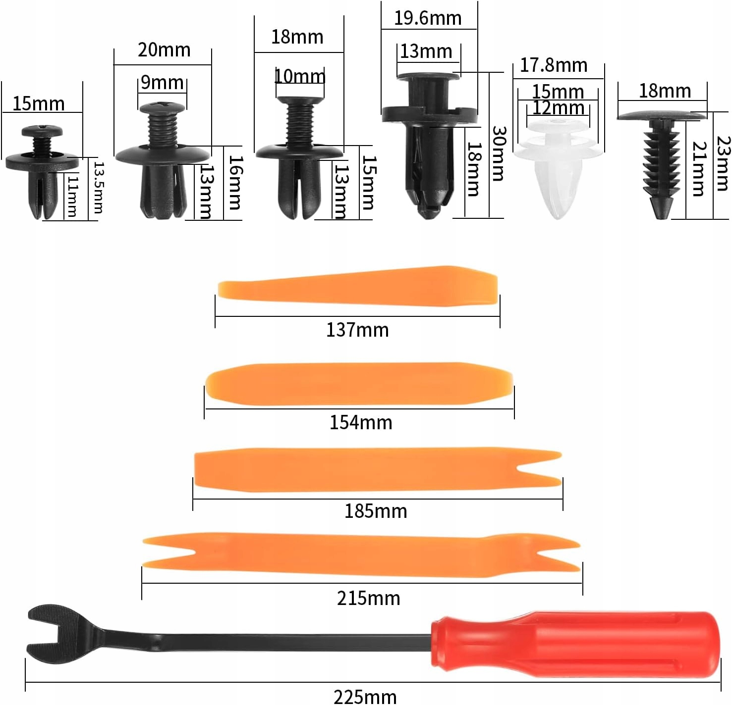 ✨ Kompletny zestaw klipsów montażowych do samochodu, idealny do szybkich napraw i wymiany spinek w zderzakach, tapicerce, nadkolach, panelach drzwiowych i wielu innych elementach. W zestawie znajduje się 100 klipsów w popularnych rozmiarach, 4 łyżki do demontażu, 1 ściągacz oraz praktyczne pudełko.